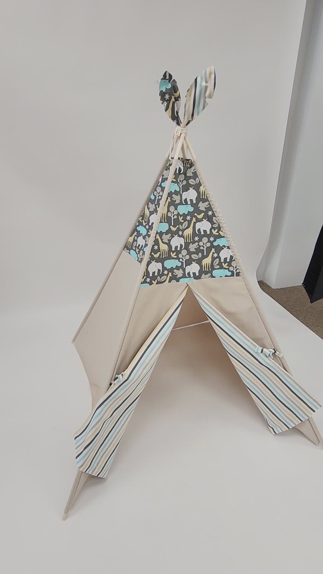 Meet our charming taupe play teepee tent, designed to create a cozy and magical space for little adventurers. The doors feature a soft blue-and-grey striped lining, while the top showcases an adorable mix of hippos, giraffes, and elephants—bringing a touch of safari whimsy to your home.