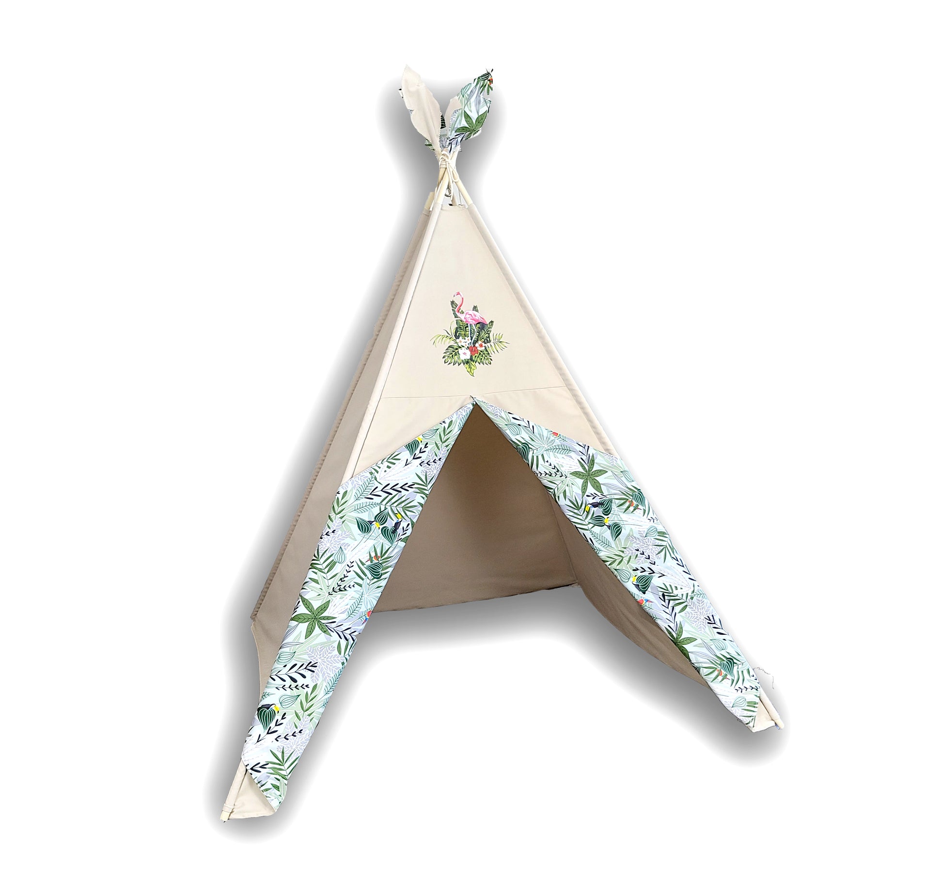 Introducing a serene and nature-inspired kid's teepee play tent, designed with kids in mind. The base fabric is crafted from thick and durable taupe material, ensuring both comfort and sturdiness. A delightful Flamingo patch adorns the front, while the back of the doors feature a beautiful Monstera Plant Print, adding a touch of tropical charm.