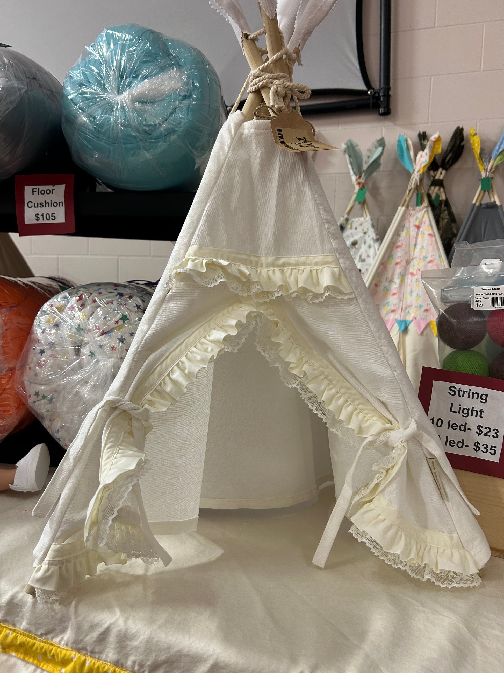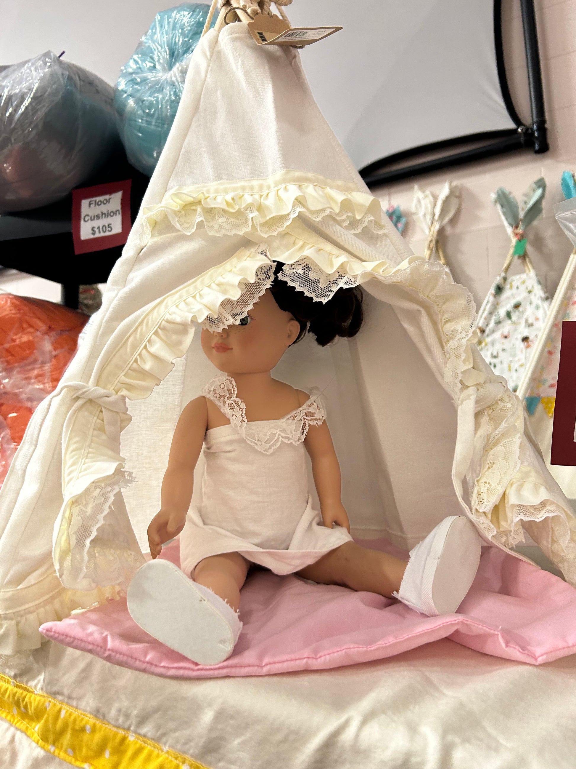 Big style, little size! This doll teepee is a miniature version of our classic ruffle tent — perfect for 18” dolls, plush friends, or little playmates.