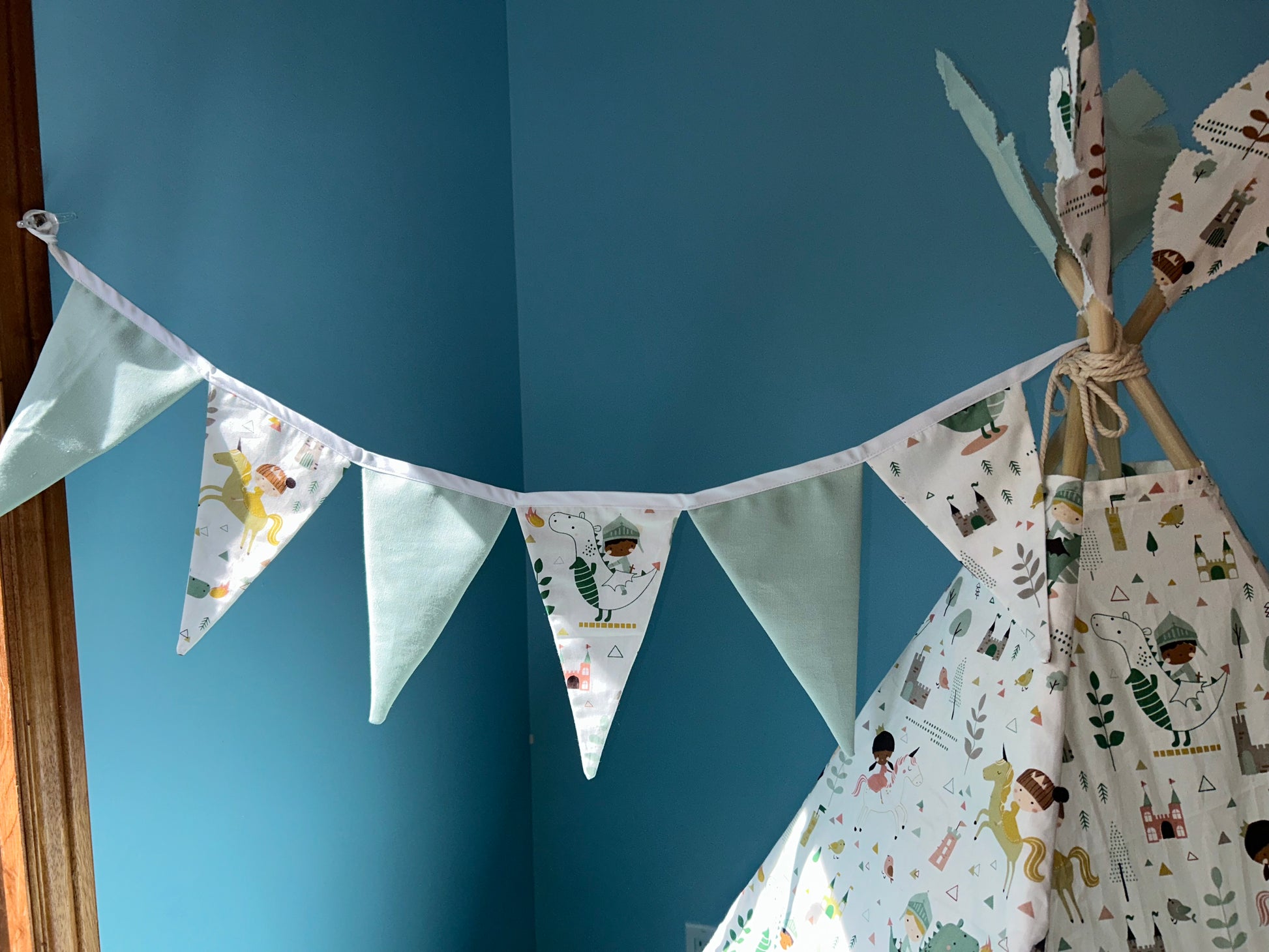 Bring storytime to life with our Kingdom Adventures Bundle! Featuring a soft mint-green base and magical print of knights, princesses, and dragons, this matching set transforms any space into a cozy castle retreat.