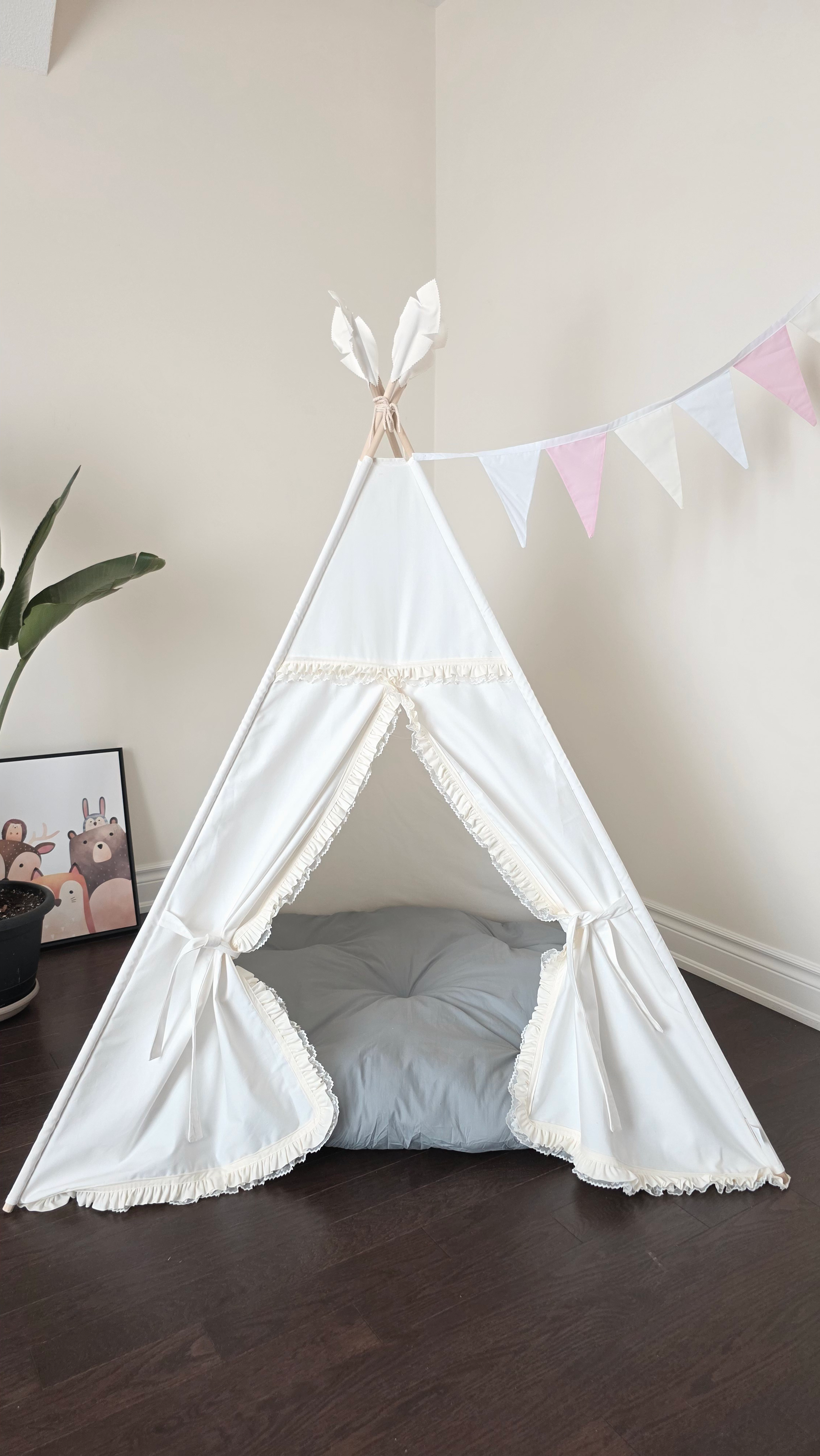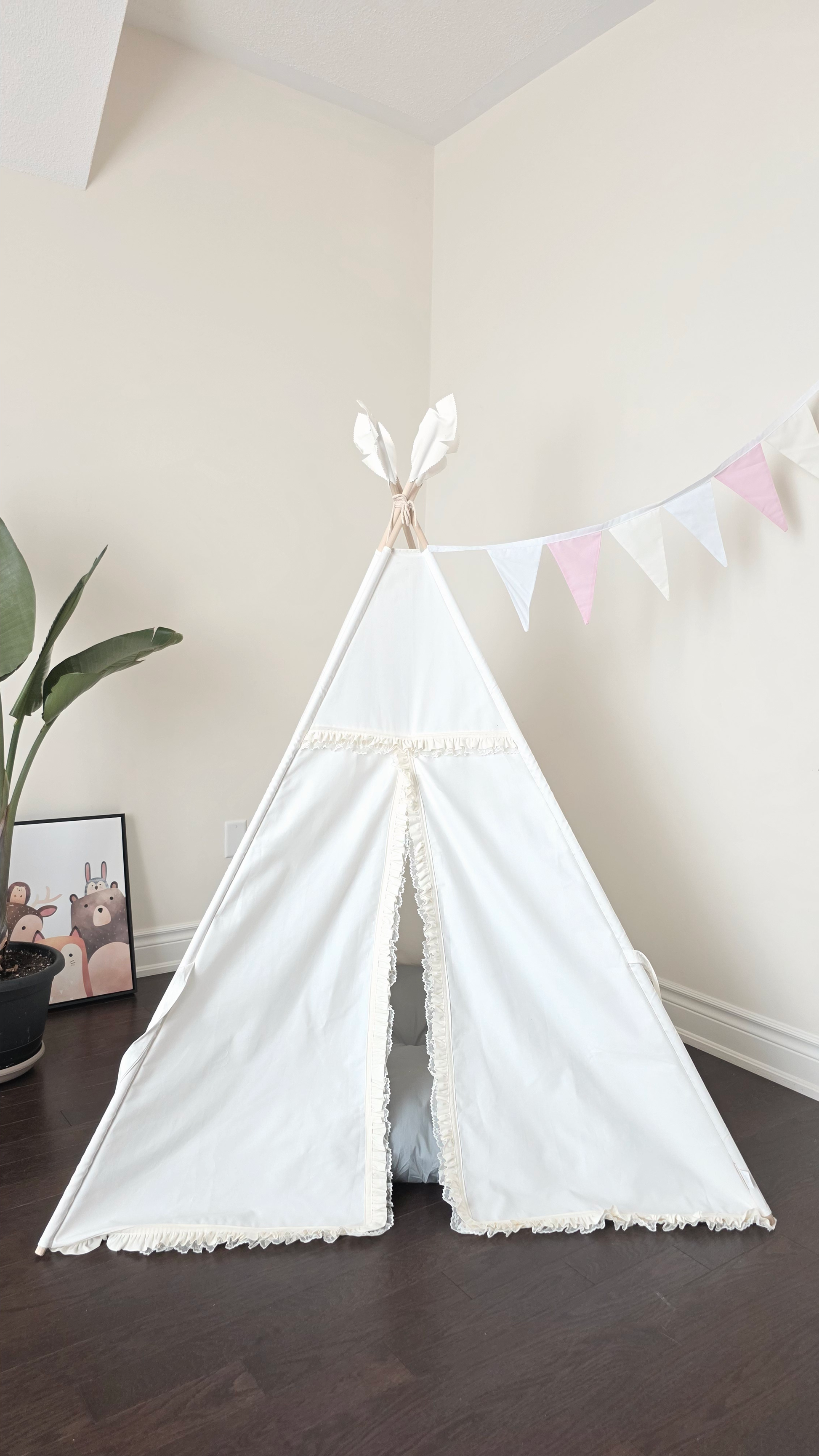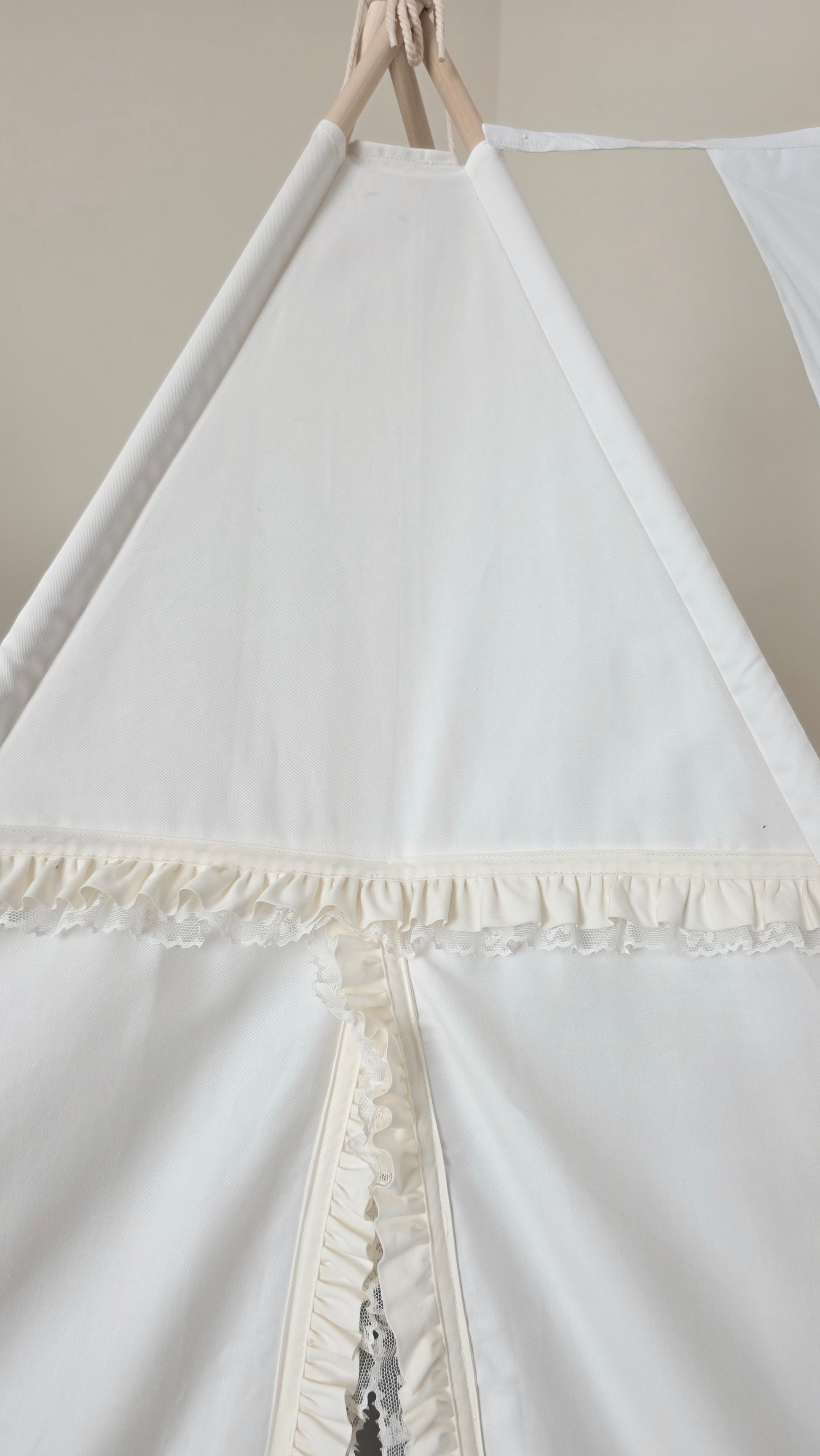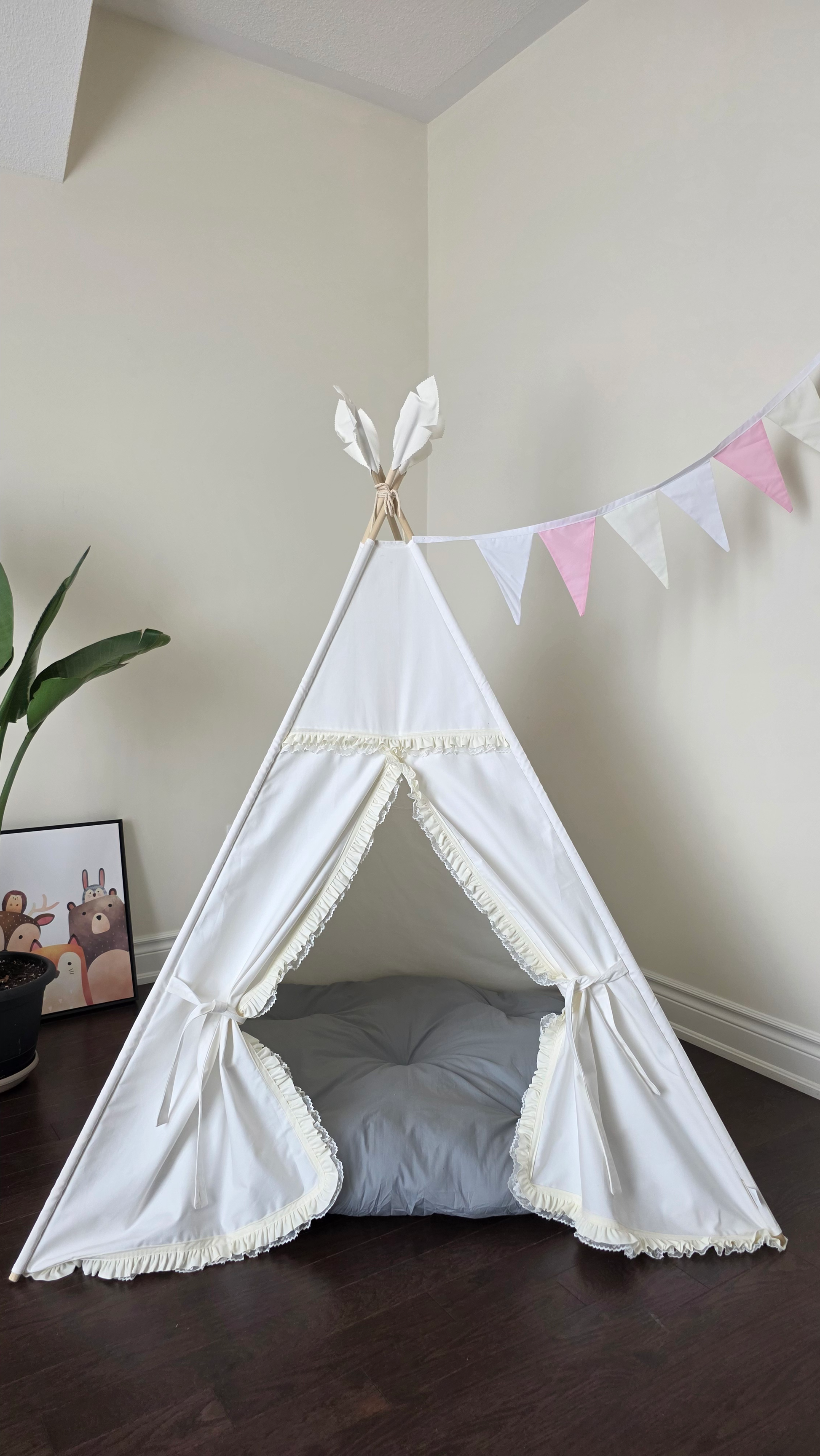 Create a dreamy hideaway with our soft white teepee, finished with delicate ruffles around the door. This medium-sized tent adds a touch of charm to any room — perfect for reading, playing, or quiet moments. Handmade with love and designed for cozy childhood memories.
