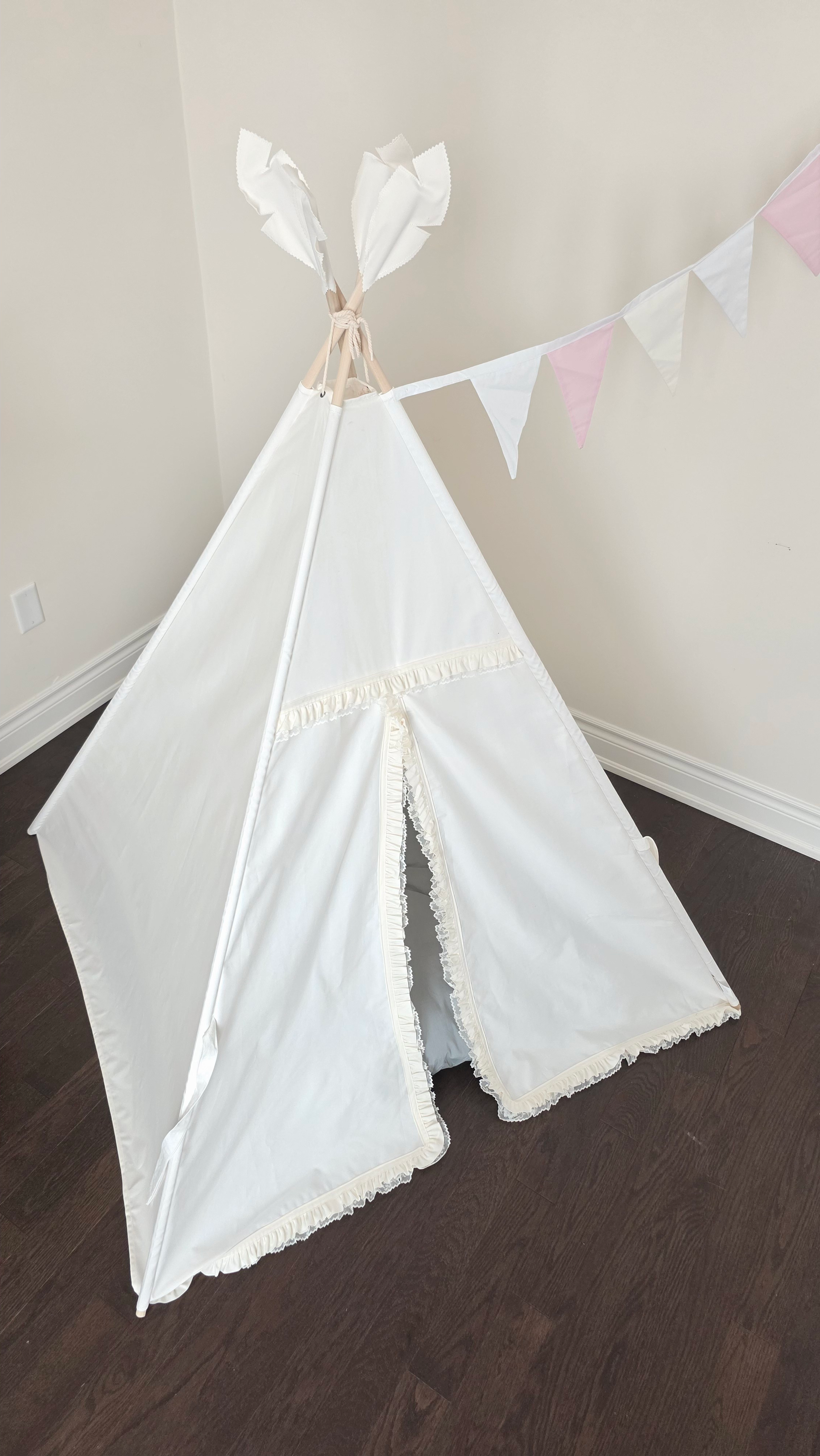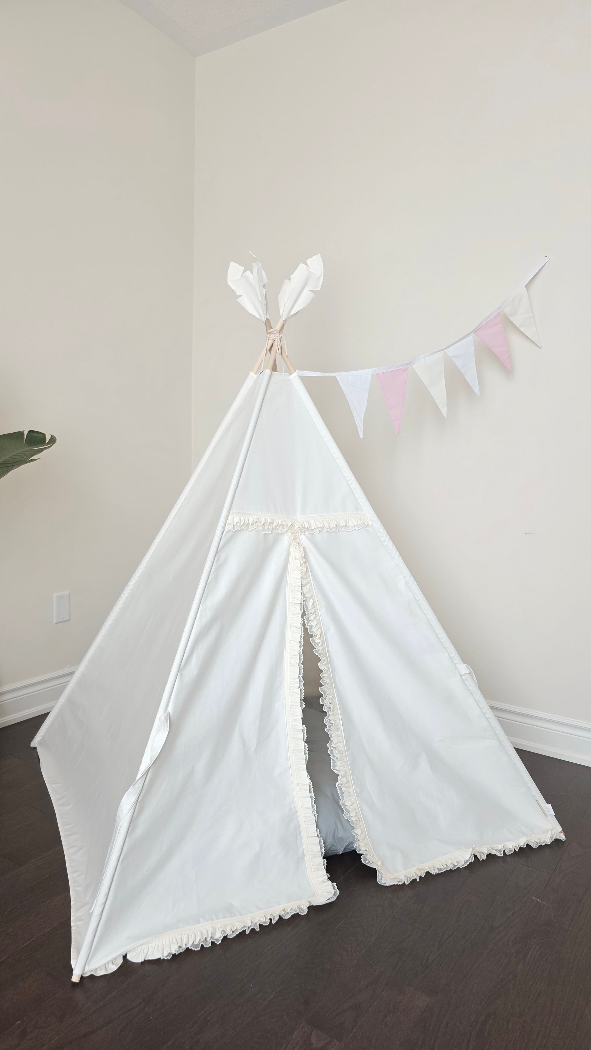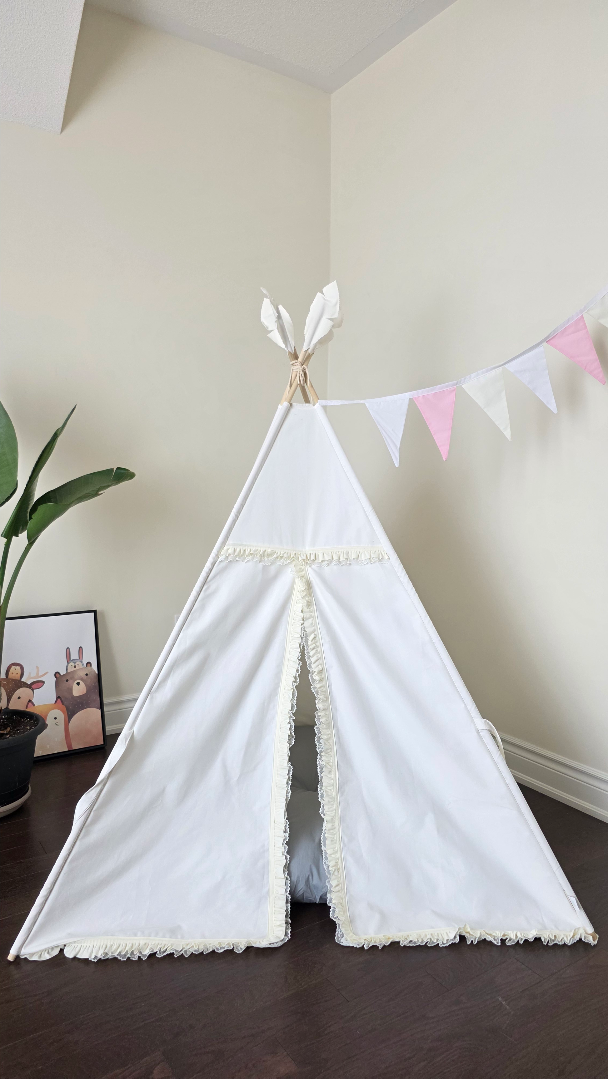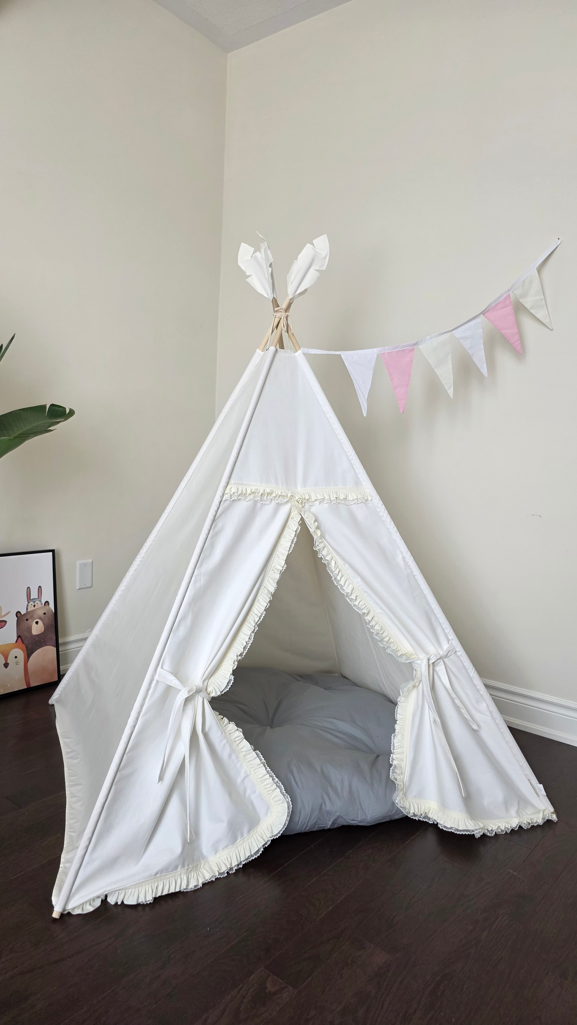 Create a dreamy hideaway with our soft white teepee, finished with delicate ruffles around the door. This medium-sized tent adds a touch of charm to any room — perfect for reading, playing, or quiet moments. Handmade with love and designed for cozy childhood memories.